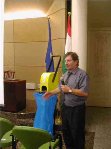 A szimpózium hallgatói és a PET palack tömörítő bemutatása